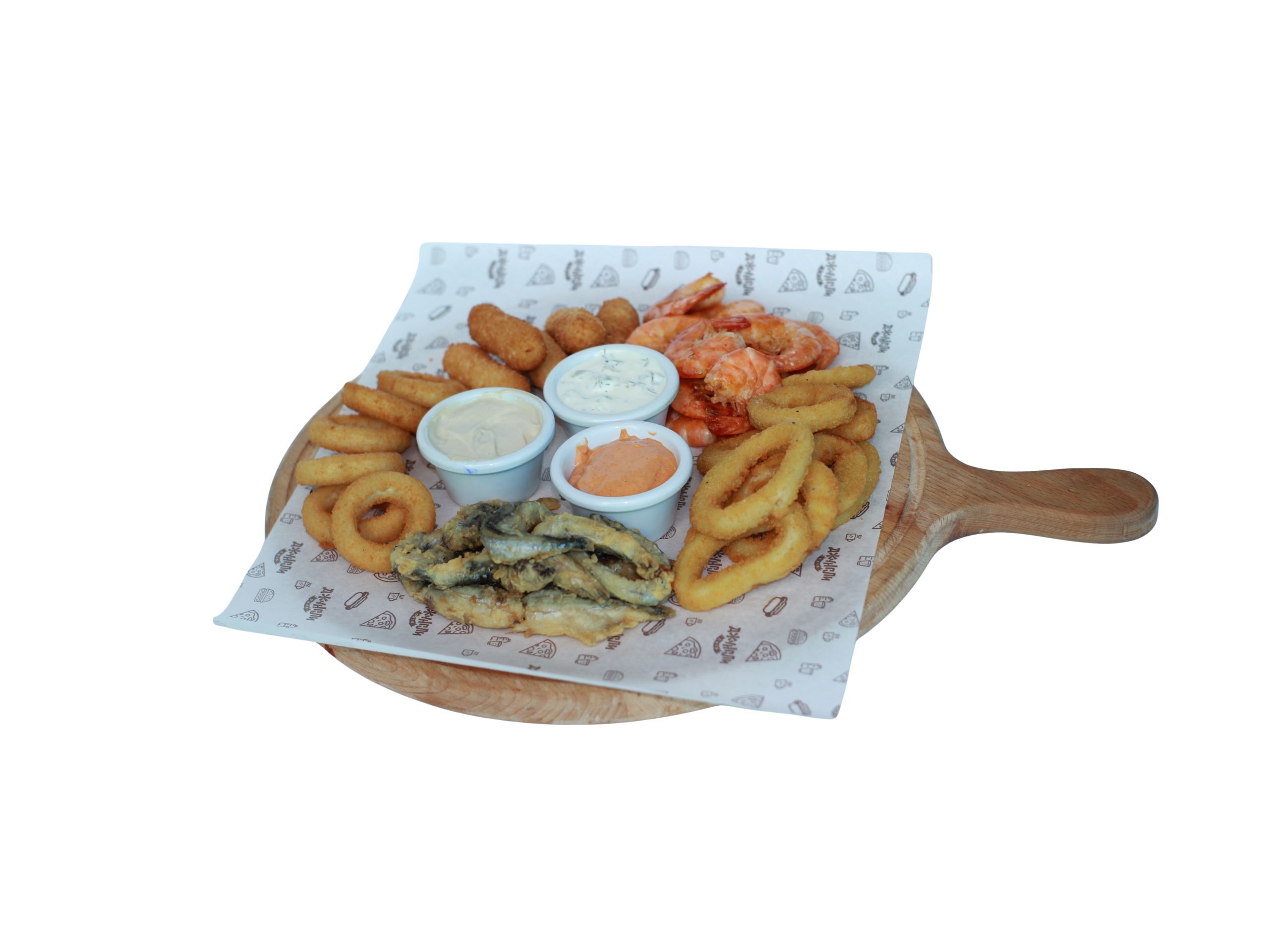 аргентинские креветки обжаренные в специях, сырные палочки, луковые кольца, кольца кальмаров, мойва жареная с тремя видами соусов: тар-тар, цезарь и спайси (720 г)