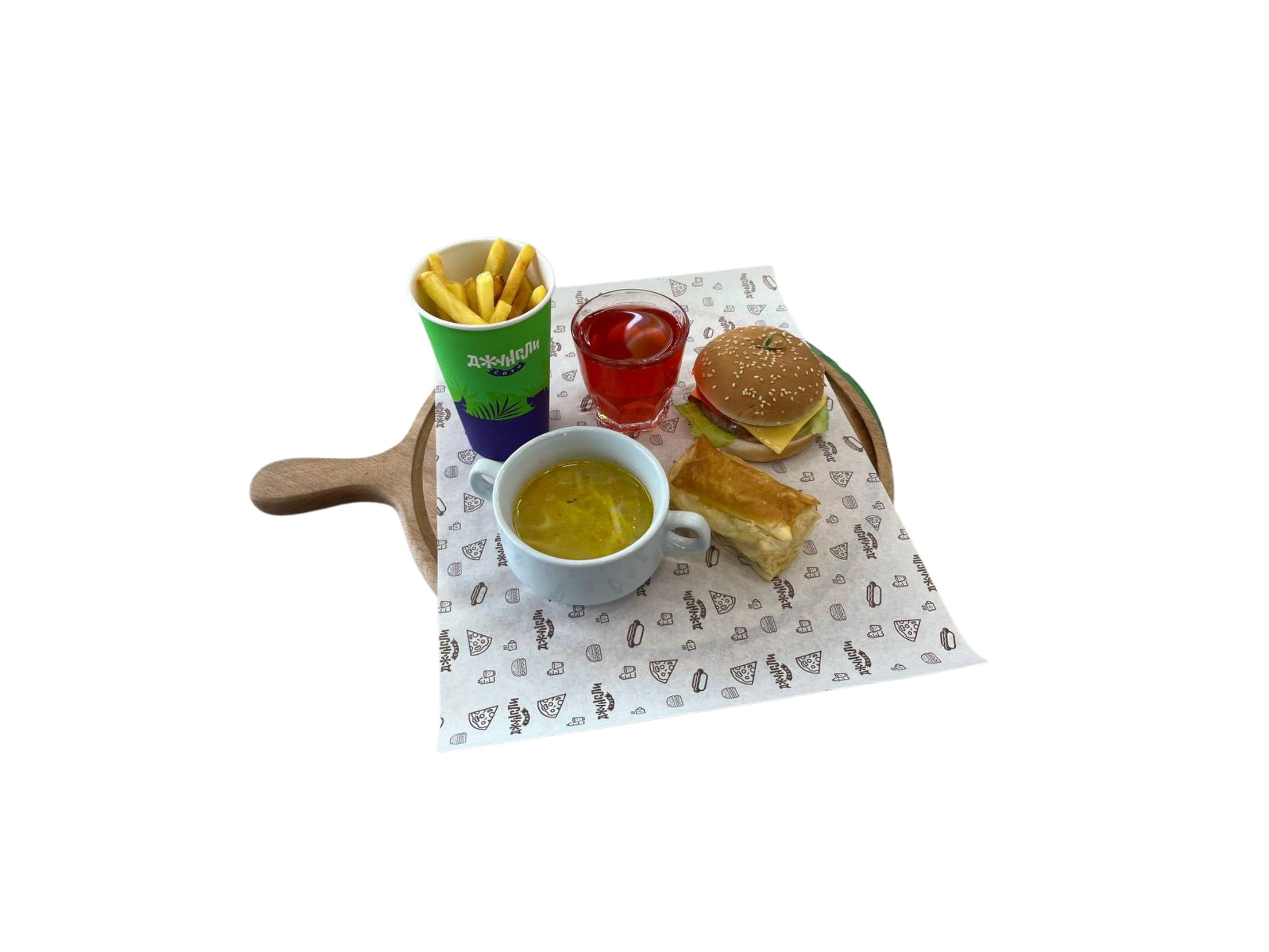 лапша домашняя, бургер с куриной котлетой мини, фри, фруктовый компот, слойка