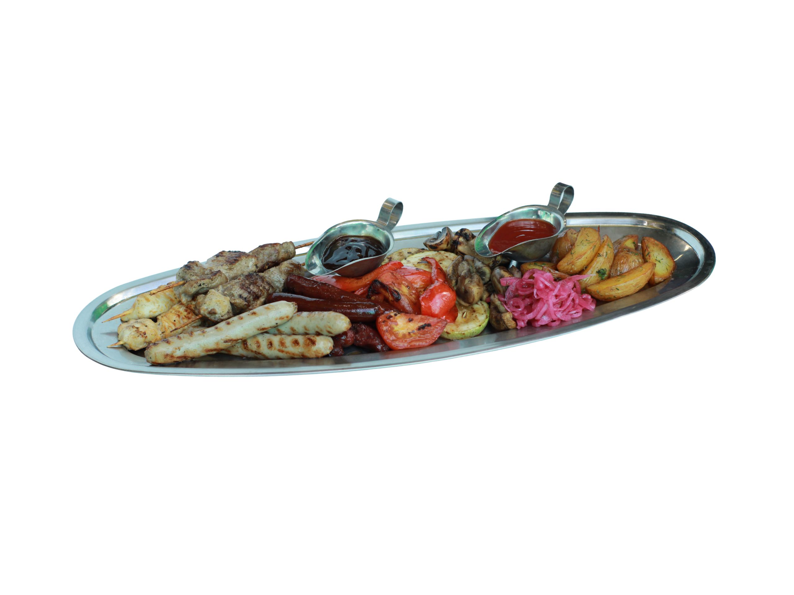 куриное филе, свиная шея, ассорти колбас, запечённые кабачки, болгарский перец, шампиньоны, томаты, картофель. Подаётся с подмаринованным красным луком, соусами BBQ и томатным (1 300 г)