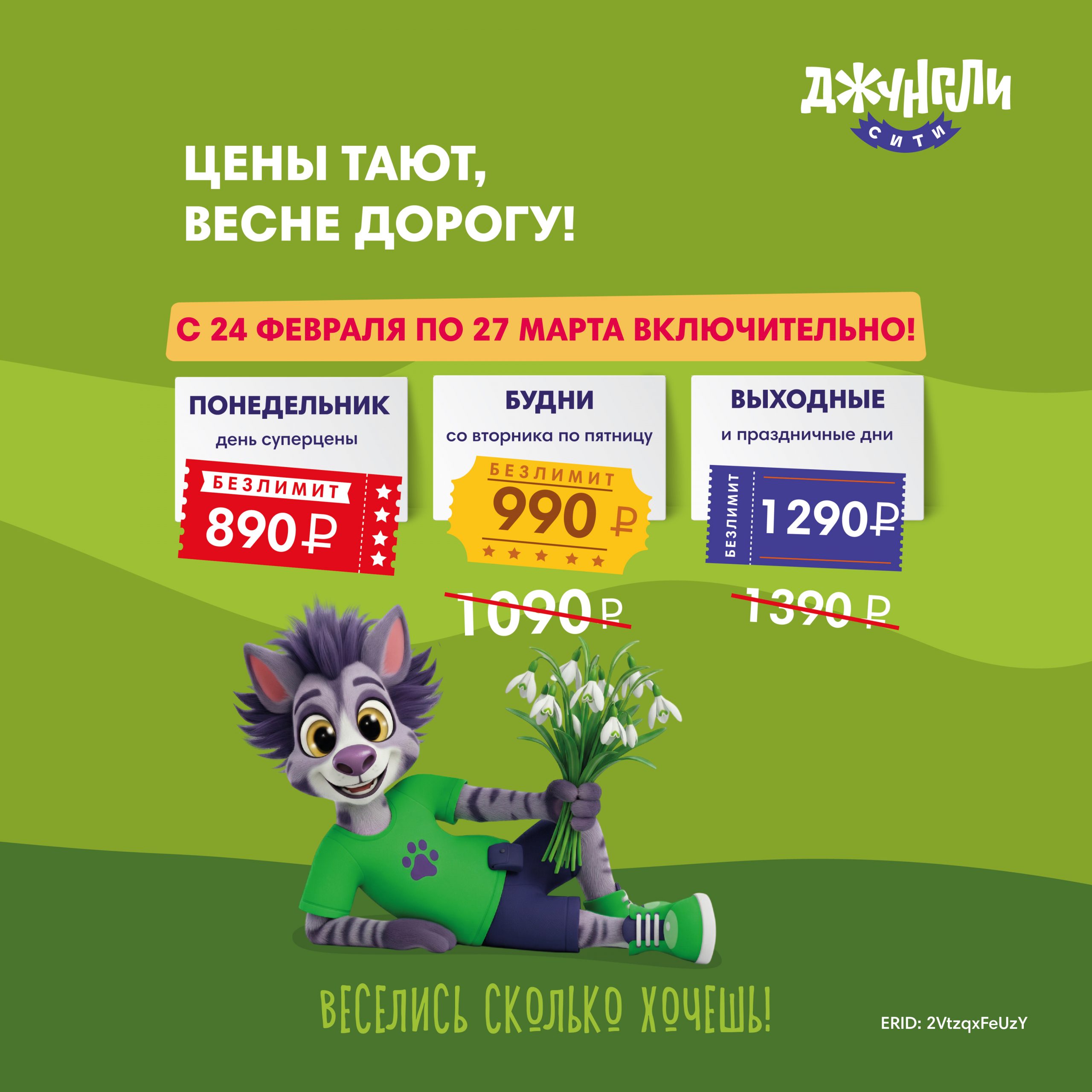 Весне дорогу! Рады вам сообщить, что в период с 24 февраля по 27 марта 2026 года в Джунгли Сити устанавливаются следующие цены на услуги по входным билетам: