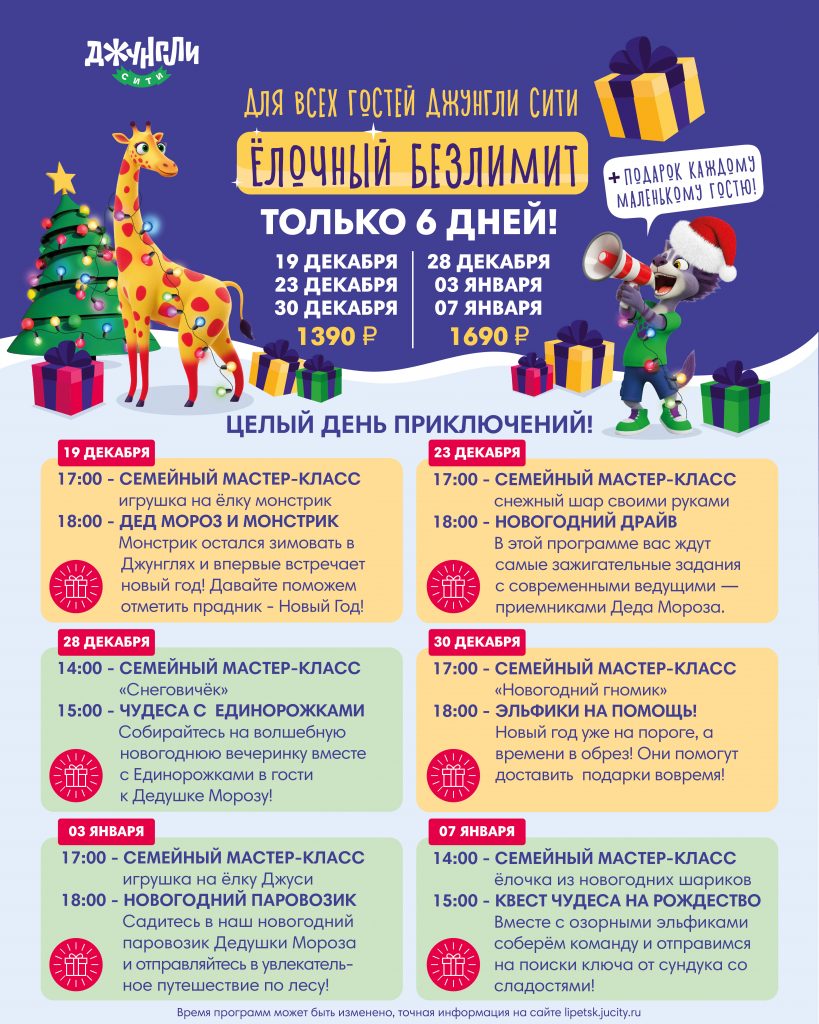В эти дни наших гостей ждет безлимитное веселье в парке, новогодние программы, мастер-классы и подарки всем участникам программы:
